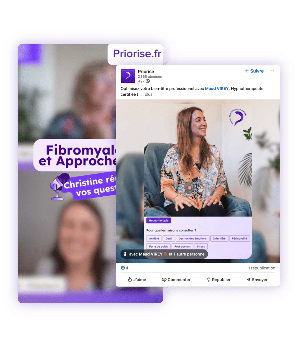 Rejoignez-nous sur Instagram et LinkedIn pour un concentré d’expertise chaque jour. Découvrez des conseils pratiques pour améliorer votre visibilité en ligne, renforcer votre crédibilité, et attirer plus de clients. Vous êtes patient ? Profitez de nos astuces bien-être pensées pour vous. Vous êtes praticien ? Apprenez à développer votre activité grâce à nos recommandations stratégiques. Suivre Priorise, c’est s’entourer d’une communauté engagée et d’idées inspirantes pour grandir ensemble !